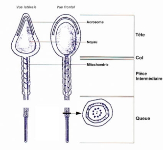 Spermatozoidi permbehet nga 2 pjese: koka dhe bishti apo flagjeli. Eshte qelize e zgjatur me diameter shume me te vogel sesa oociti ( 0.05mm). Koka mbulohet nga nje kellef qe quhet acrozom ne te cilen ndodhen enzimat. Keto enzima kane per funksion te hapin nje tynel ne shtresen e jashtme te oocitit ne menyre te tille qe spermatozoidi te bashkohet me oocitin. Flagjeli siguron levizshemrine dhe progresin drejt oocitit ( nga cervix, neper miter, deri ne tubin e Fallopit )